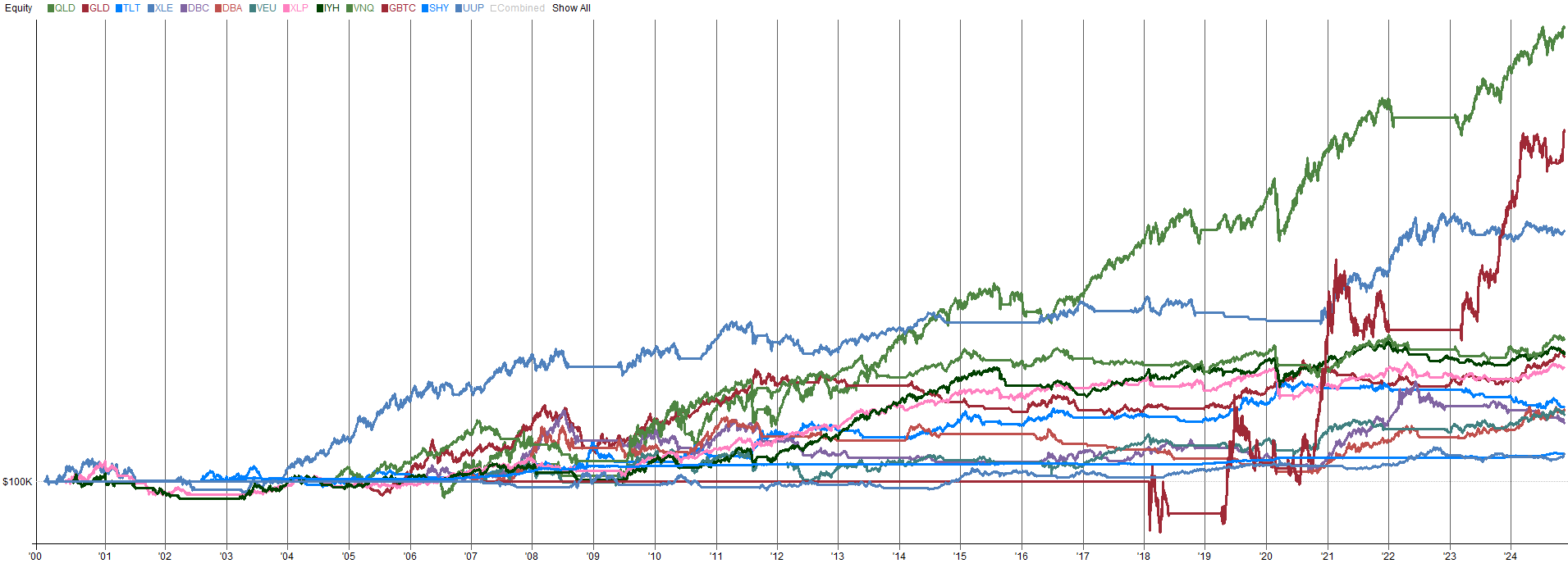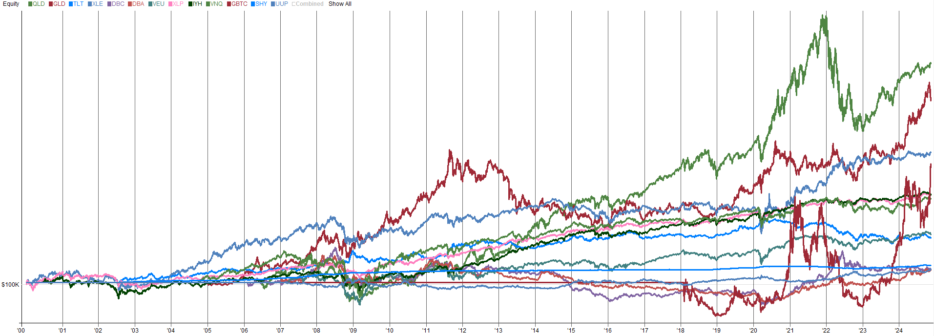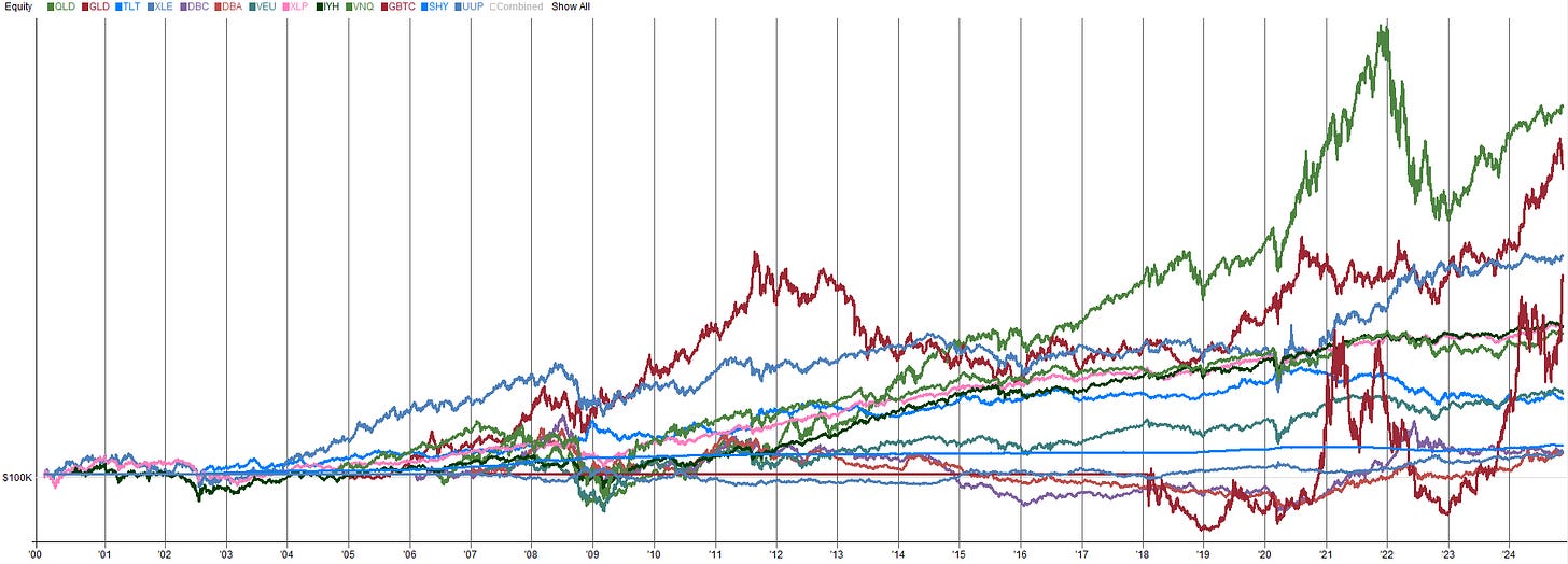 Here are some assumptions that apply to each of the three All Weather portfolios we will explore. Each of the three All Weather portfolios will use the same list of ETFs, but the way the system works will be different. Each system will rebalance or reallocate on the first of each month. Each test will be from 2000 to today (2024). Some ETFs did not exist in the very beginning of the backtest, so performance during the first few years may be misrepresented. By 2007 all ETFs were available except GBTC (which was available starting in 2015). No leverage was used in any of these tests. Let’s begin.