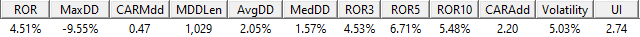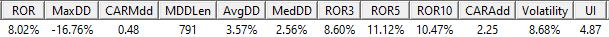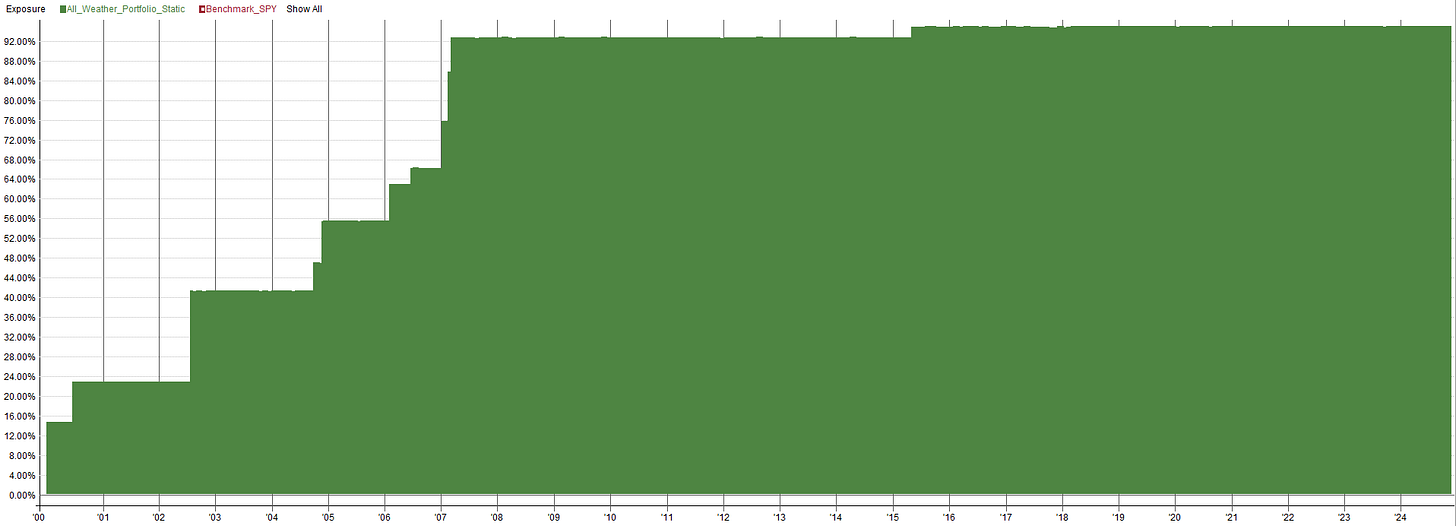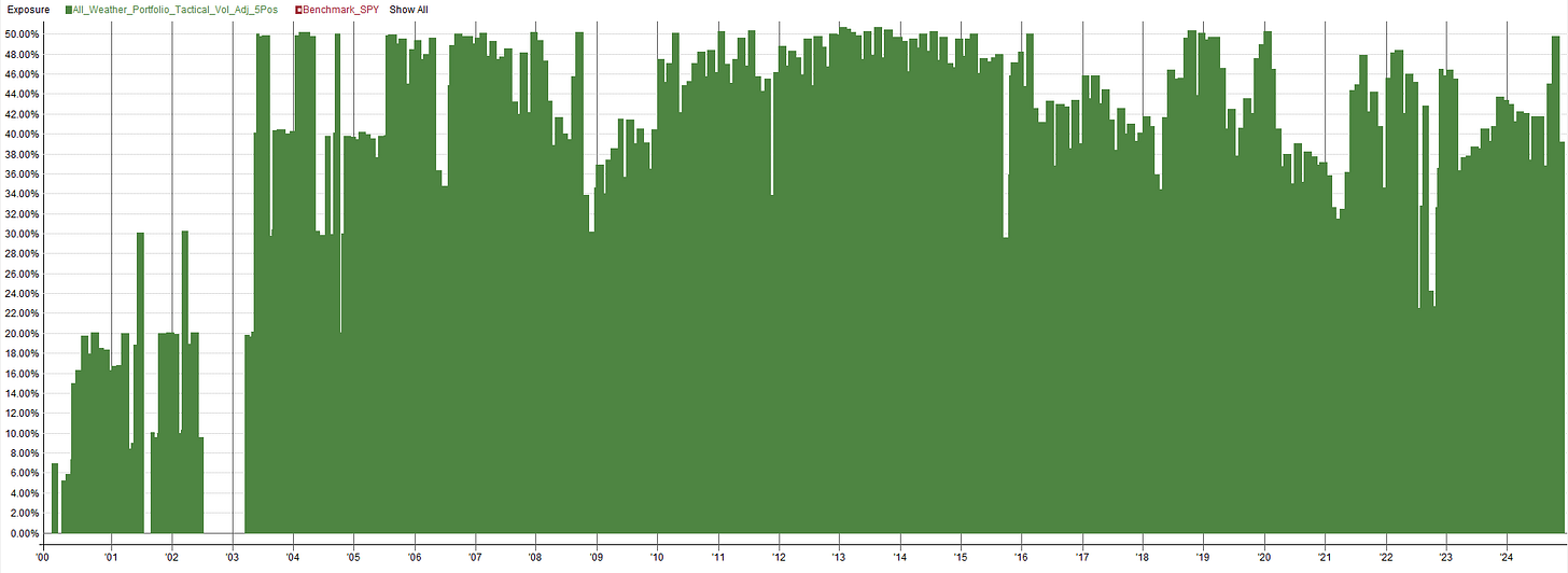 As you can see, the system is extremely low volatility, low drawdown, but also low returns. The equity is very stable over time, as the volatility based position sizing ensures all ETFs contribute a similar volatility to the overall portfolio. Since these ETFs are somewhat uncorrelated, this provides a smoother ride along the equity curve. From the exposure plot (calculated as the percentage of total capital invested in the market), the system is mostly under exposed for the entire duration of the backtest. To increase returns, we need to find a way to bump up our average exposure over time. This is where a modification of this All Weather portfolio will come into play.