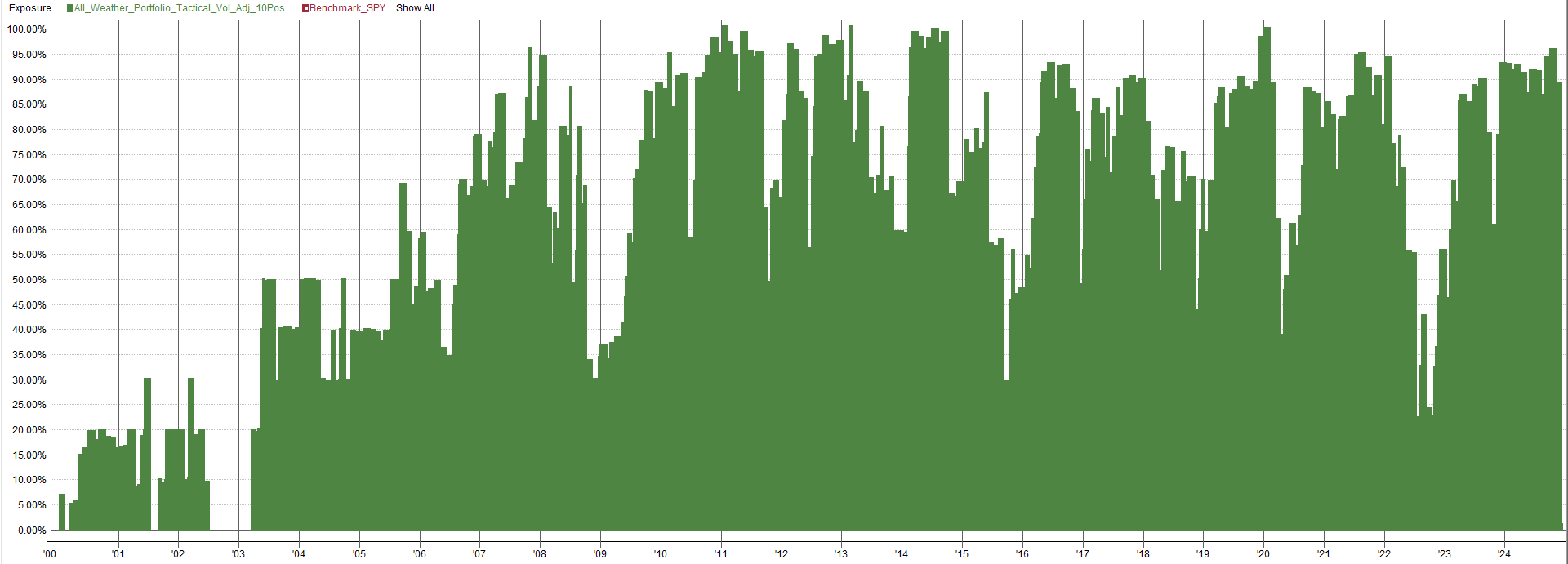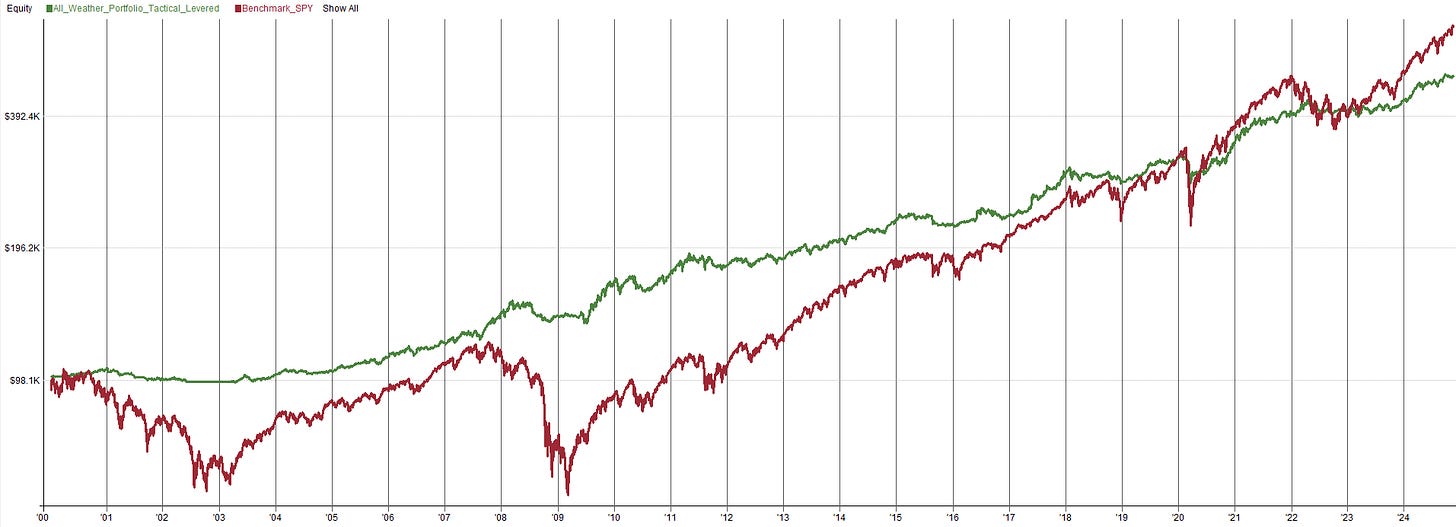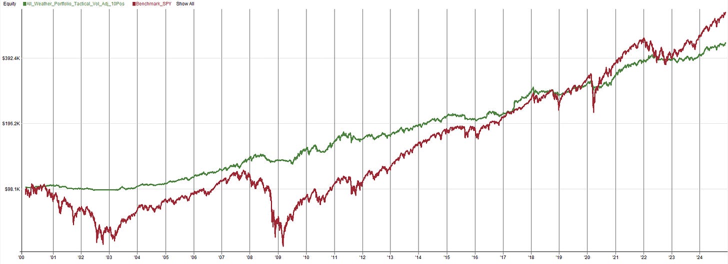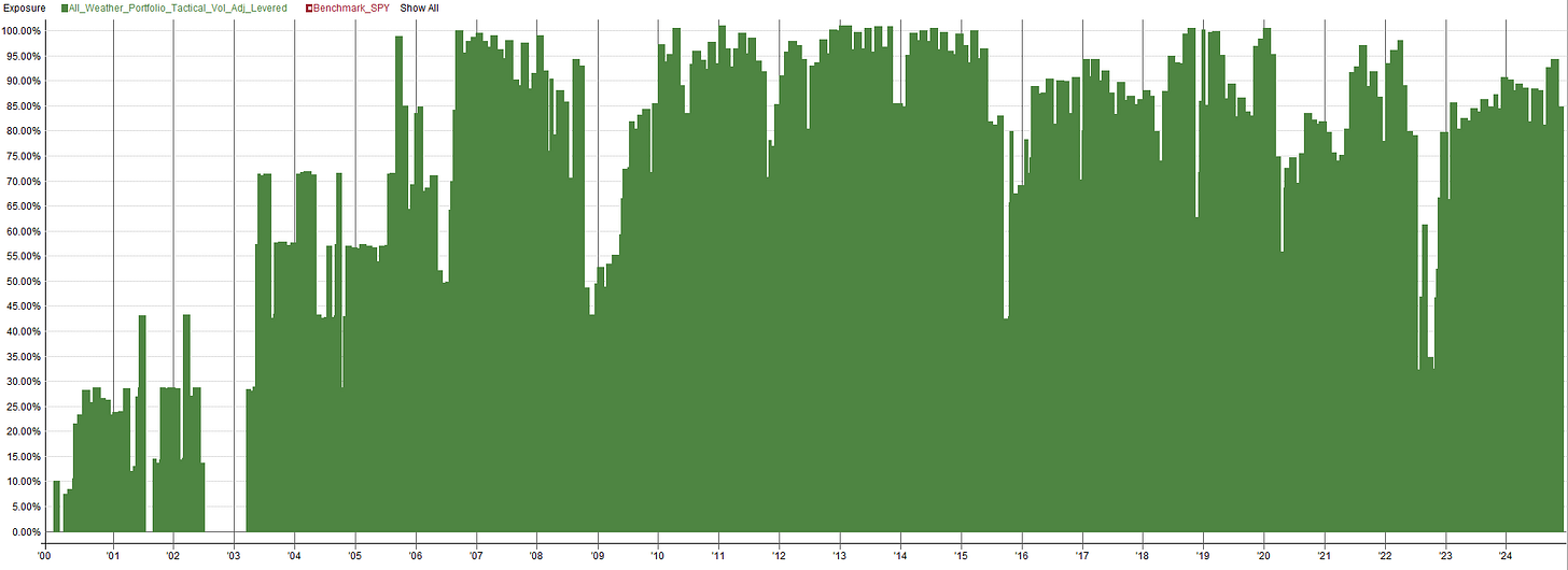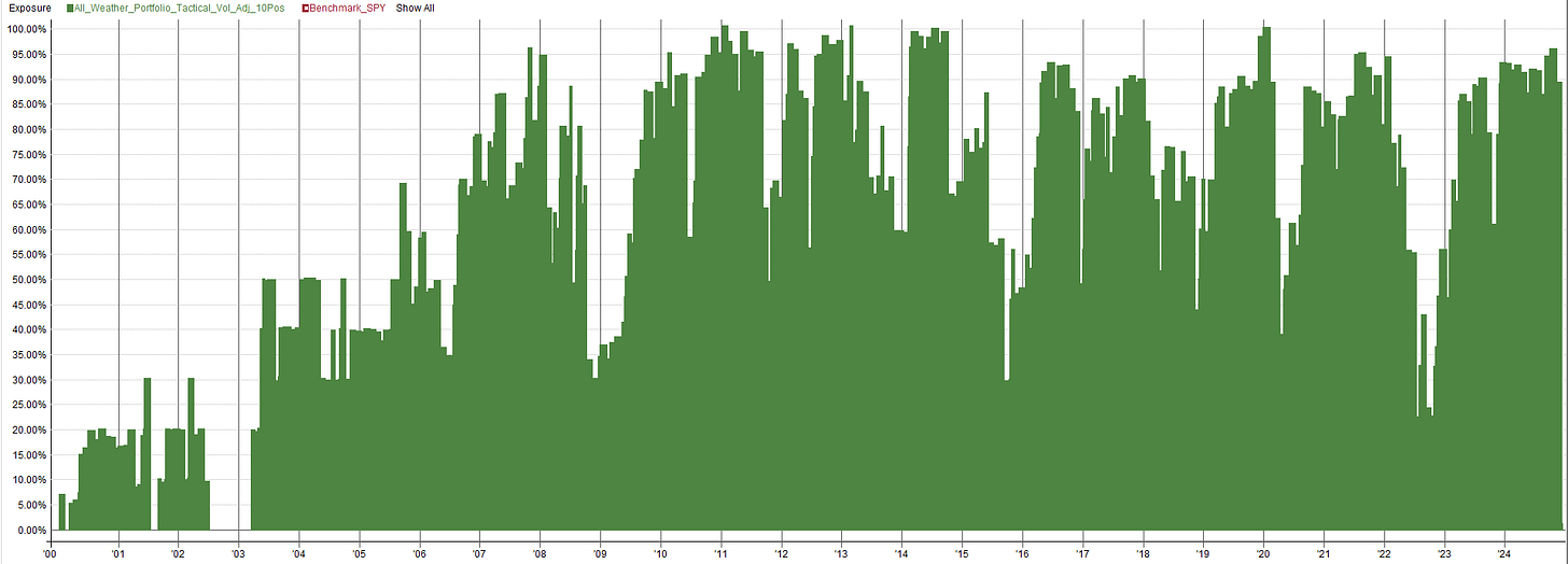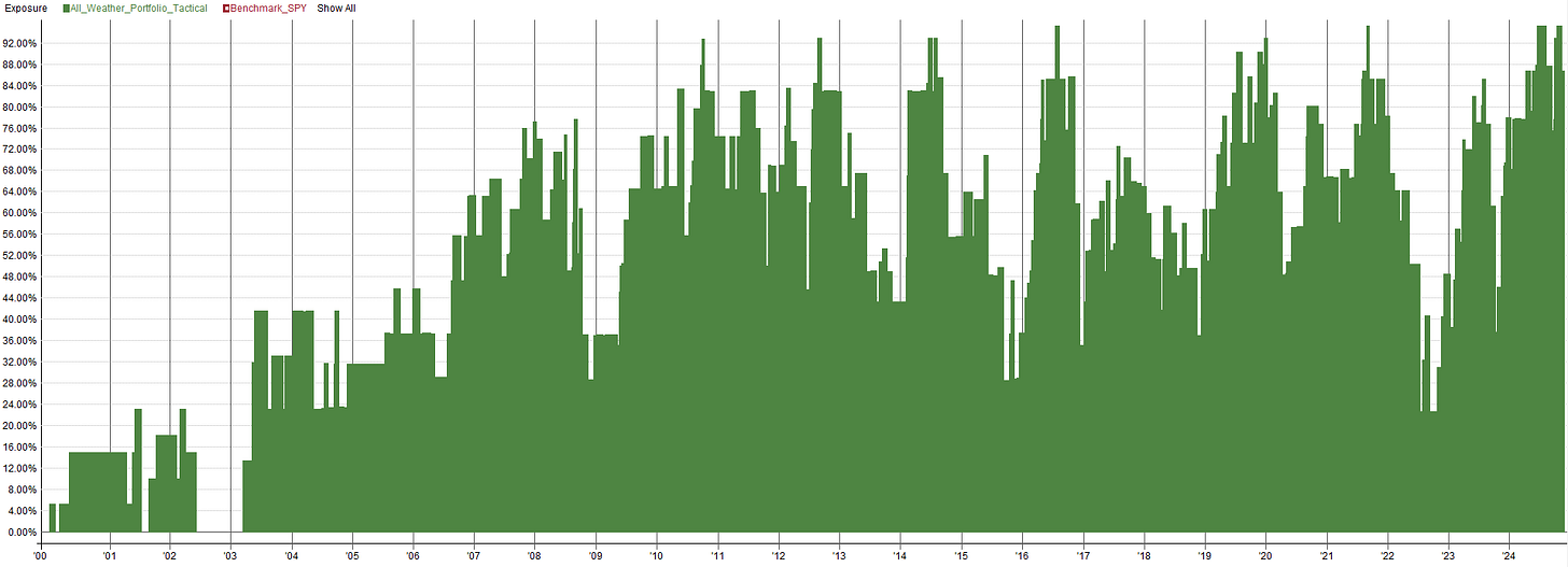 Now, you can see exposure is near 100% for the majority of the backtest. The compounded annual growth went from 4.51% to a more respectable 6.54%, and the drawdown is still low at 13.43%. Not too bad. The system survives 2008, 2022 is just a flat spot, and the 2020 Covid crash is about 1/3 the drawdown that SPY experienced. That’s pretty good for such a simple system! But we can do better. We still have one more All Weather portfolio to look at, which will take this process one step further and again improve performance all around. So let’s get to it!