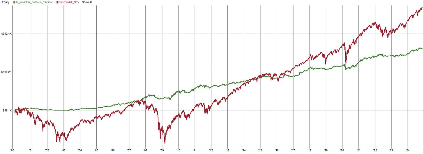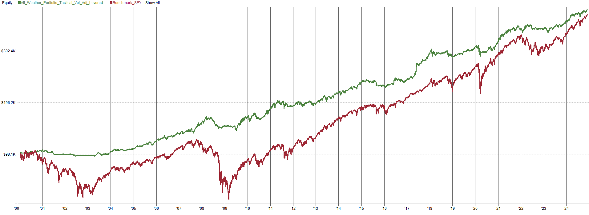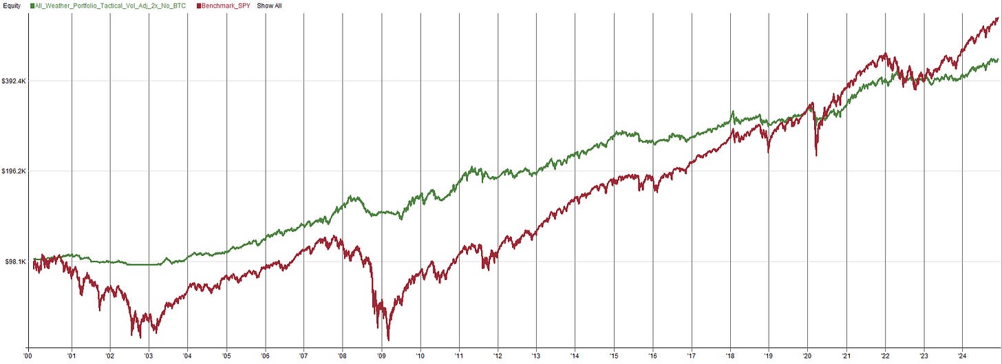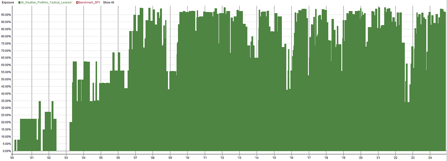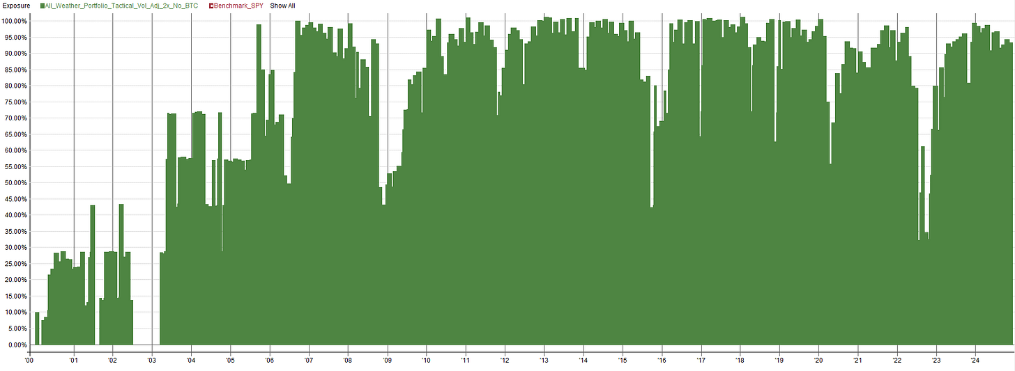 Now, you can see exposure is near 100% for the majority of the backtest. The compounded annual growth went from 4.51% to a more respectable 6.54%, and the drawdown is still low at 13.43%. Not too bad. The system survives 2008, 2022 is just a flat spot, and the 2020 Covid crash is about 1/3 the drawdown that SPY experienced. That’s pretty good for such a simple system! But we can do better. We still have one more All Weather portfolio to look at, which will take this process one step further and again improve performance all around. So let’s get to it!