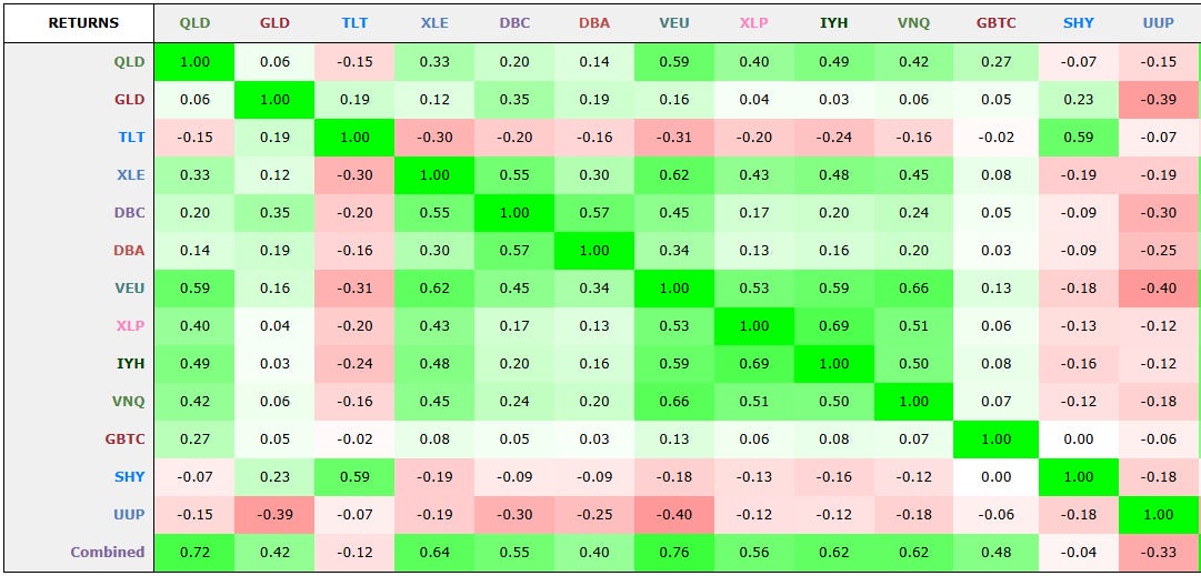 If you have other ETF ideas, let me know, let’s add them, the more the merrier. A correlation matrix of the returns of the ETFs listed above looks like the following: