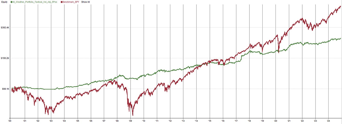 As you can see, just reducing from 10 to 5 positions leads to less returns because we only use half the money. So, we are then going to double the position size, to fully utilize all the capital with the 5 positions. See below for an equity curve of the final third All Weather portfolio with 5 positions and 2x the position size of the 10 position All Weather portfolio: