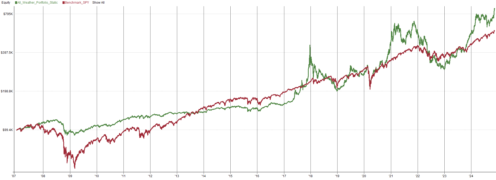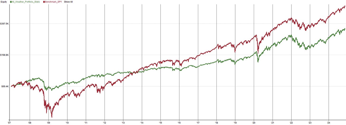 One drawback of the approach I used to determine allocations is I used all the data to make the allocation decisions, which isn’t ideal. My allocations used in say 2010 are influenced by years 2011 to 2024, which have not occurred yet. To avoid this future leak, you could just used fixed fractional position size (all positions are the same size), but this will likely result in more volatile results. Or you could do a rolling allocation where the allocation is readjusted every year based on the average of the previous years volatility, but this adds complexity that a passive investor may not want to worry about. In the third All Weather portfolio, I will address this allocation issue, so no need to worry we are building our way there, though the solution is a little more active than this first All Weather portfolio.