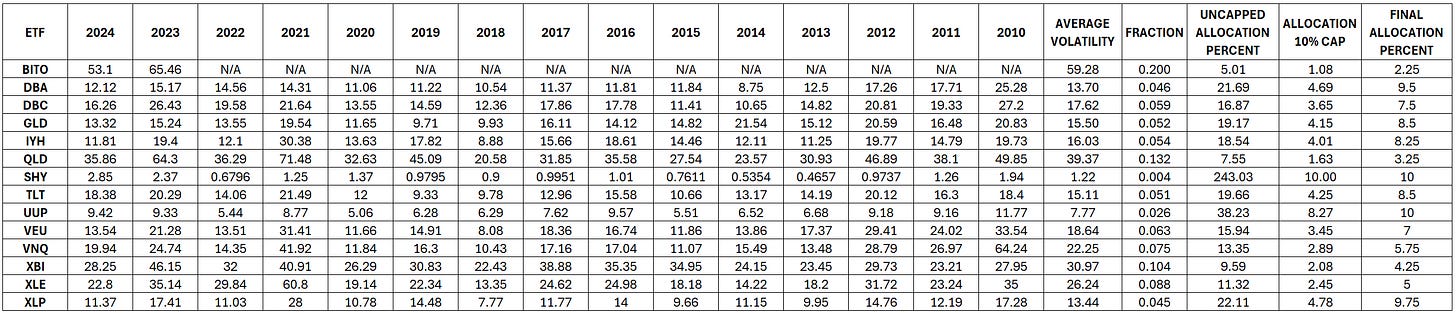 To determine the static allocations for each ETF, I calculated the volatility of each ETF for every year from 2010 to 2024 and averaged the results. Then I found the allocation required to give to each ETF such that they contribute equally to the overall portfolio. Then I capped any individual allocation at 10% and scaled the remaining allocations up until exposure summed to 100%. Those allocations are shown in the table below: