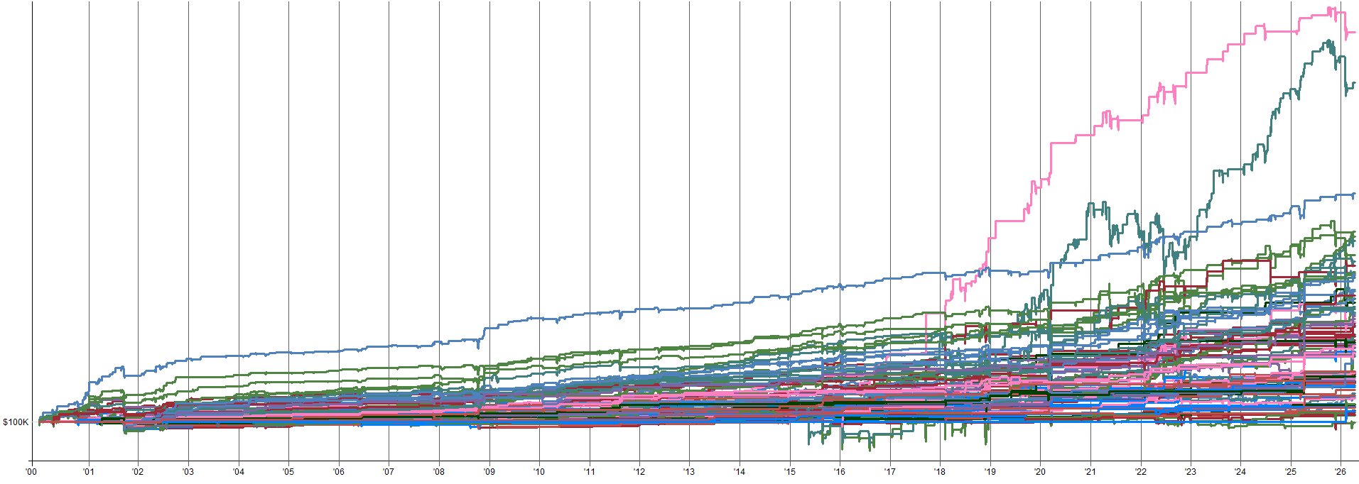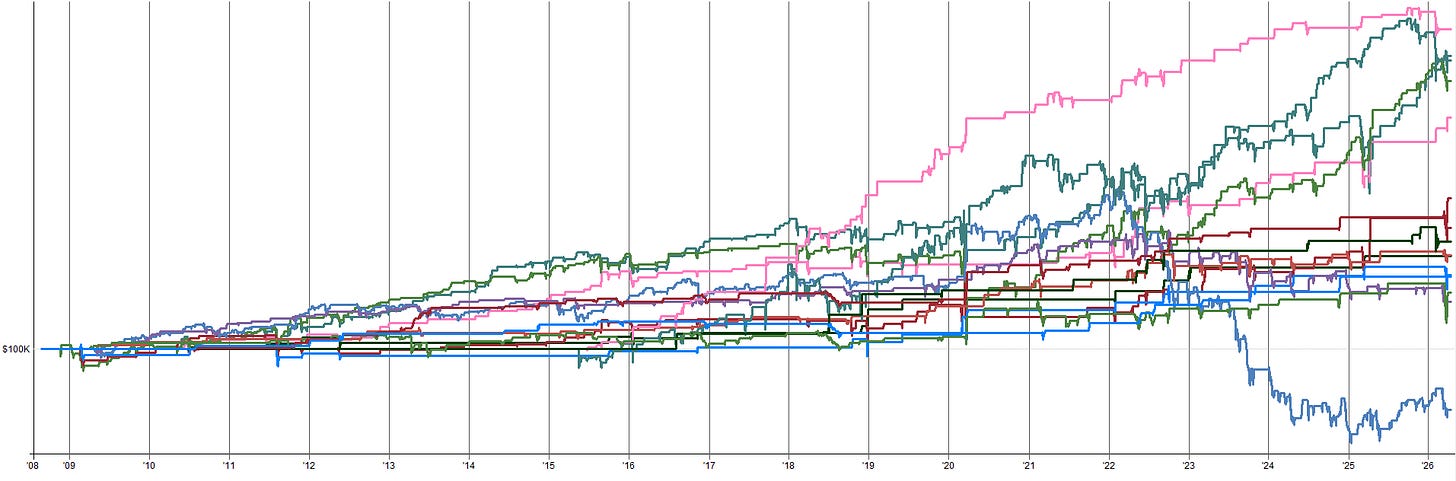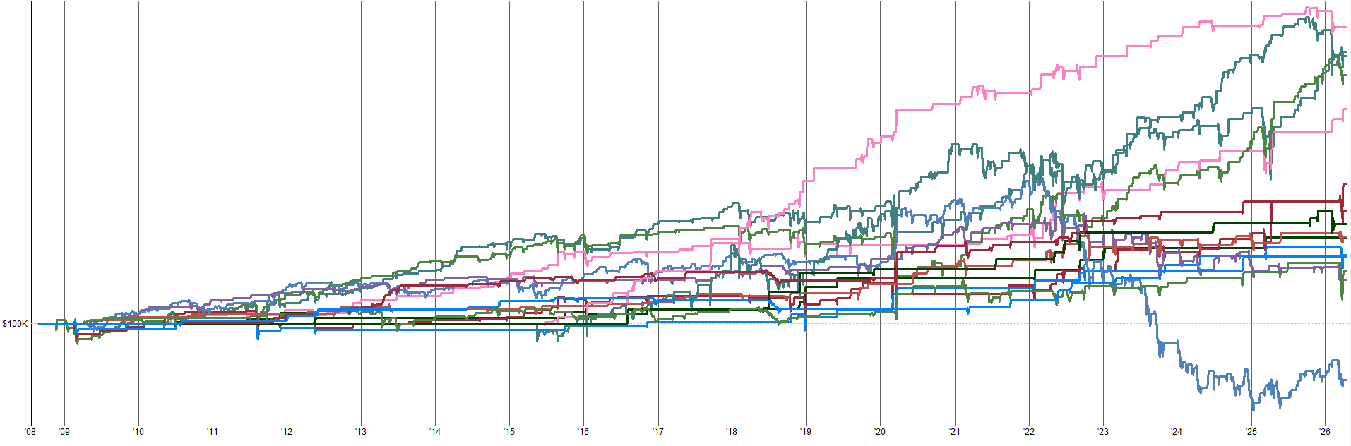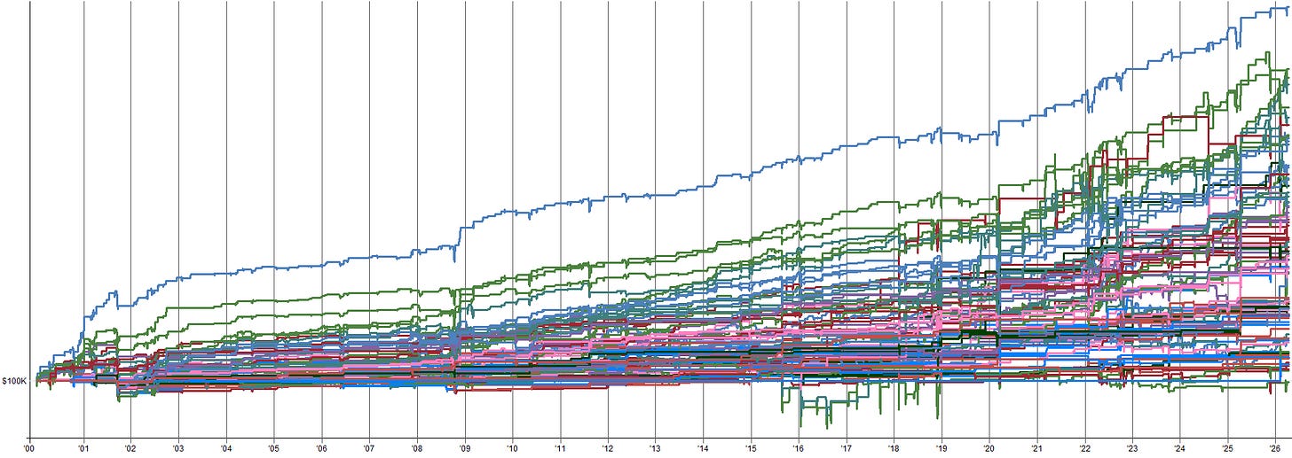 If I show all the individual equity curves that comprise the non-leveraged mean reversion mini-portfolio, it looks like what’s shown below.