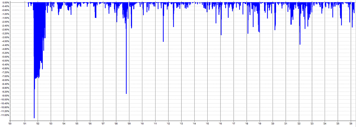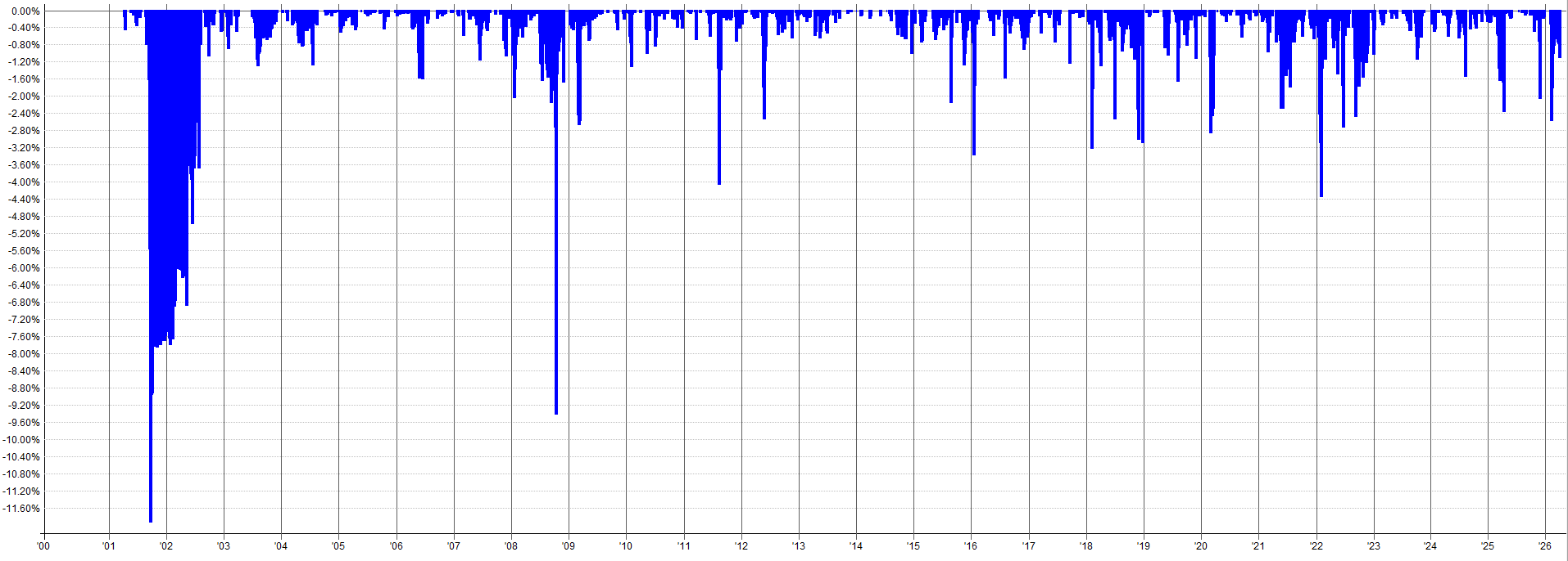 To see what this mean reversion portfolio looks like on the non-leveraged ETFs, check out the equity curve and drawdown plots below. Non-leveraged ETFs allows us to test further back in time since leveraged ETFs became available around 2011, but the un-leveraged versions have been available since the early 2000’s.