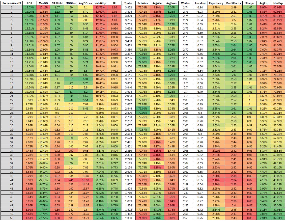 The default ExcludeWorstX of 0 means all equity curve within the mean reversion mini-portfolio trade. Excluding the worst-ranked equity curve generally makes performance slightly worse (you use less exposure and potentially miss out on some recovery trades from temporarily underperforming equity curves that got turned off before recovering), but it helps control total mean reversion mini-portfolio exposure.