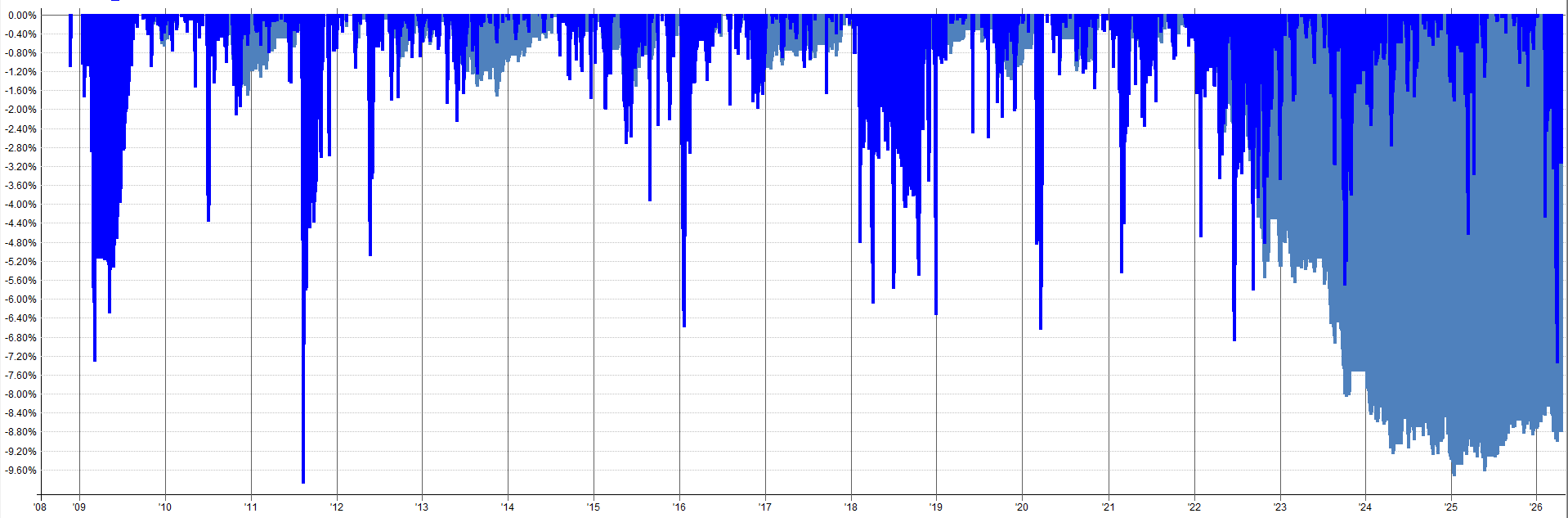 The image below shows the drawdown equity curve of the combined Z_reversion system as a whole (dark blue) compared to the bond first sub-entry (light blue) drawdown.