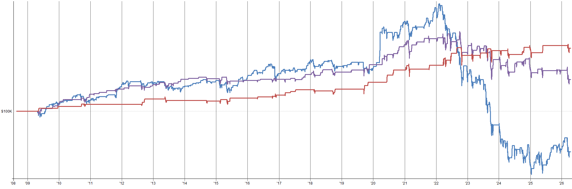 Sub-entry two (purple) is down recently too, but not nearly as bad. Sub-entry three (red) is actually still up and to the right and is not in a drawdown. While sub-entry one looks terrible, sub-entry two and three look significantly better.