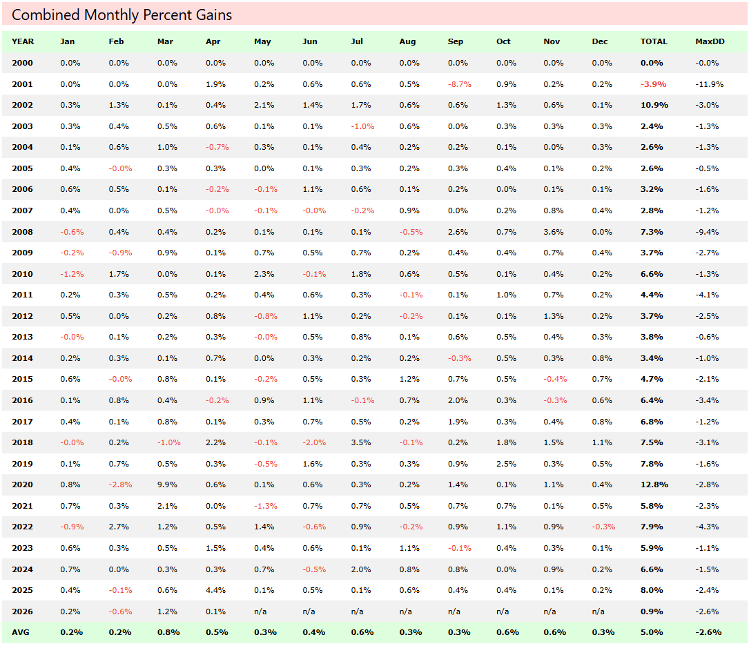 Let’s look at the combined mini-portfolio’s monthly returns laid out in a grid. This is one of my favorite ways to understand the performance of a portfolio because you can immediately see the consistency (or lack of it) across time.