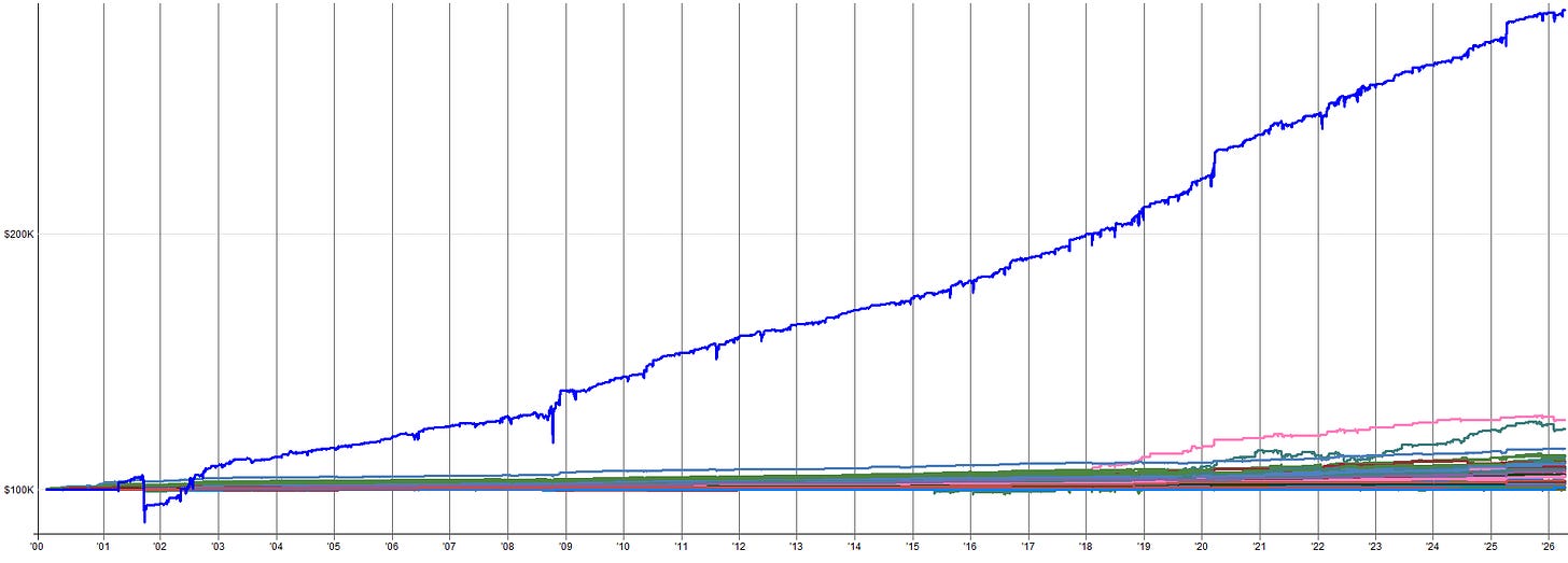 If you only trade the best backtested system, sometimes it’s hard to know if it’s the best because it is actually better, or if it’s actually just the most curve fit.