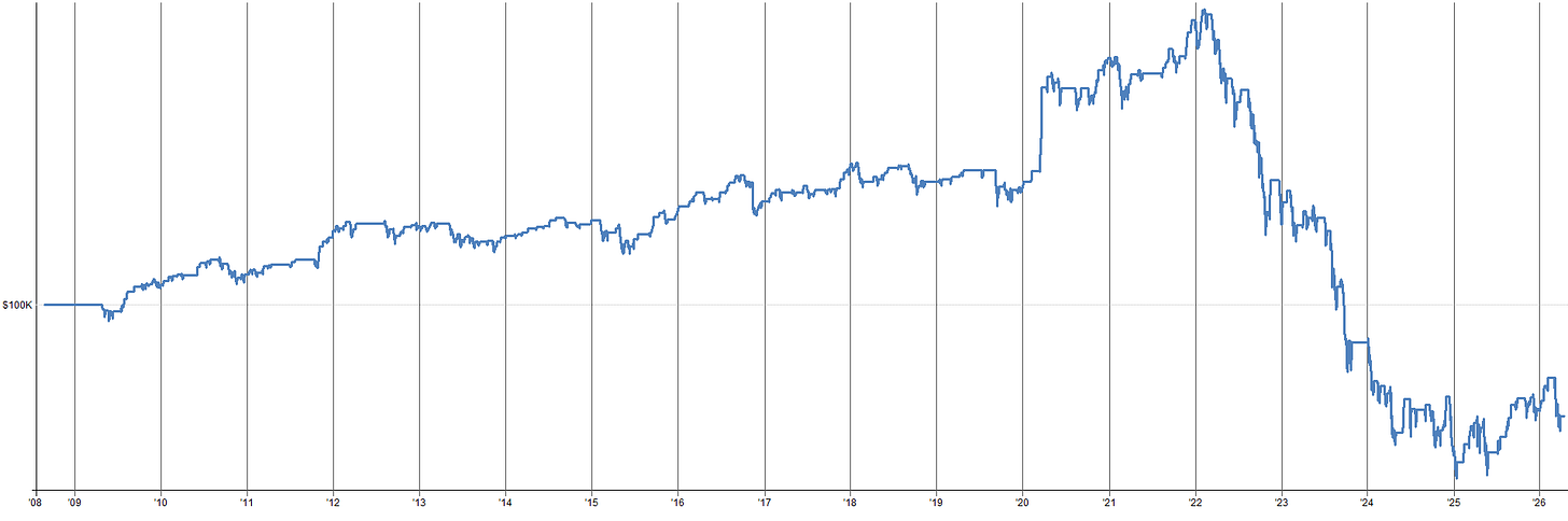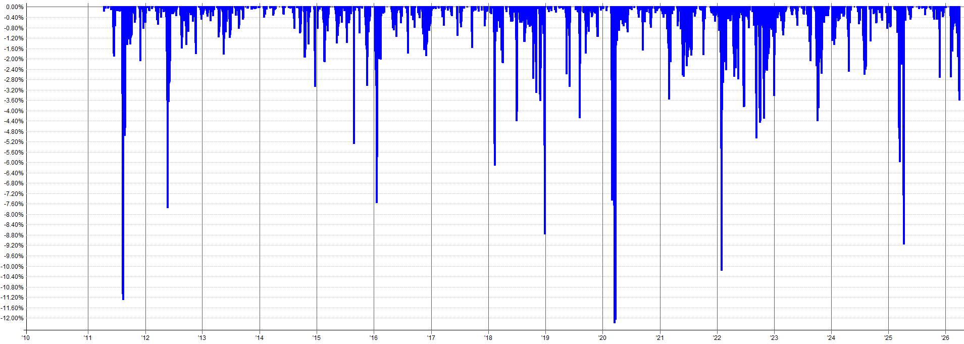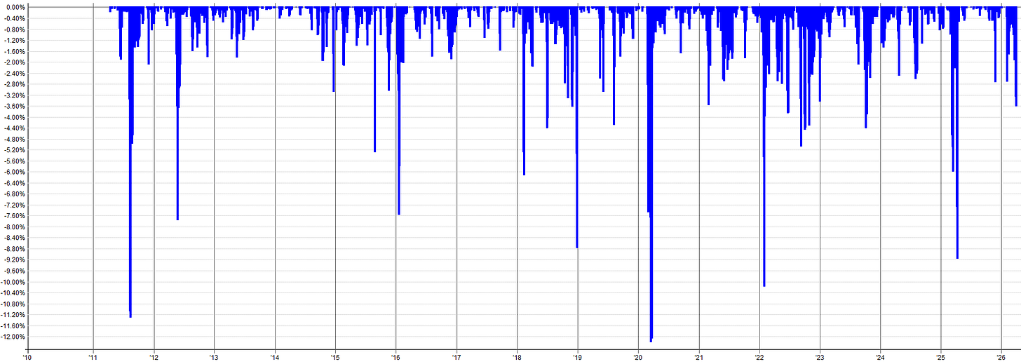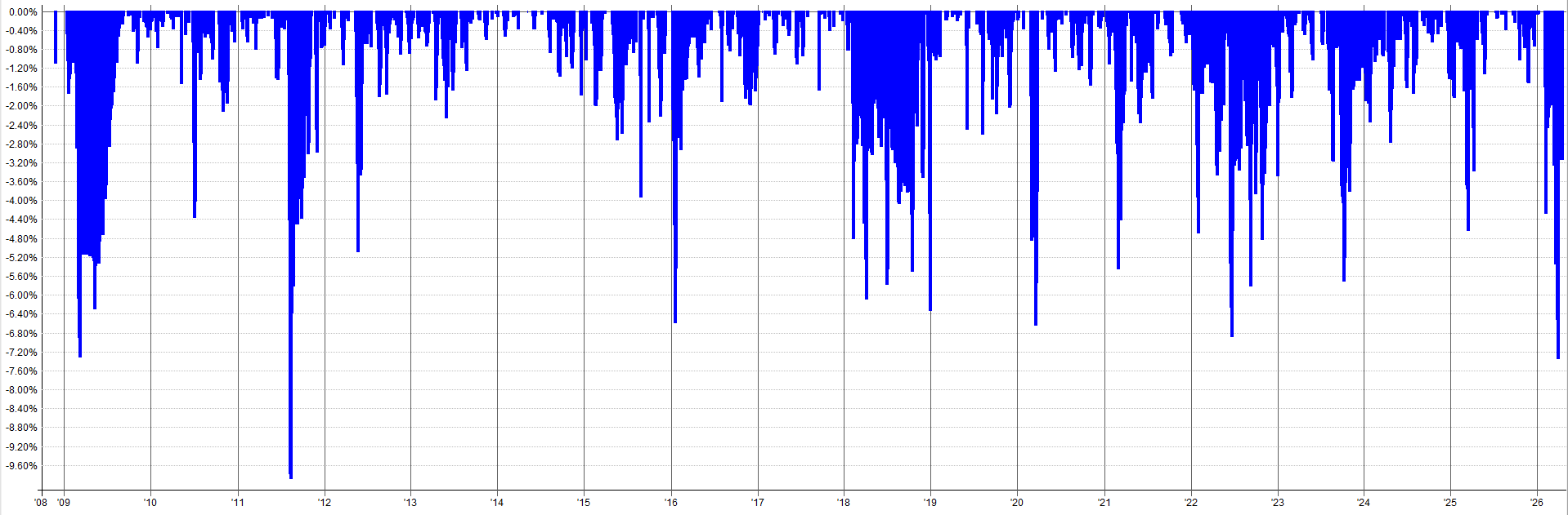 This mean reversion mini-portfolio is the opposite. It has very short periods of flat performance and quick drawdown recoveries. It slots into my portfolio well and provides me with great portfolio level performance benefits.