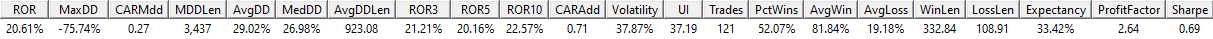 To refresh what the in-sample results of the system looked like, below I have the system equity curve in green (benchmarked to the S&P 500 in red), followed by the performance stats of the system, and then the drawdown plot.
