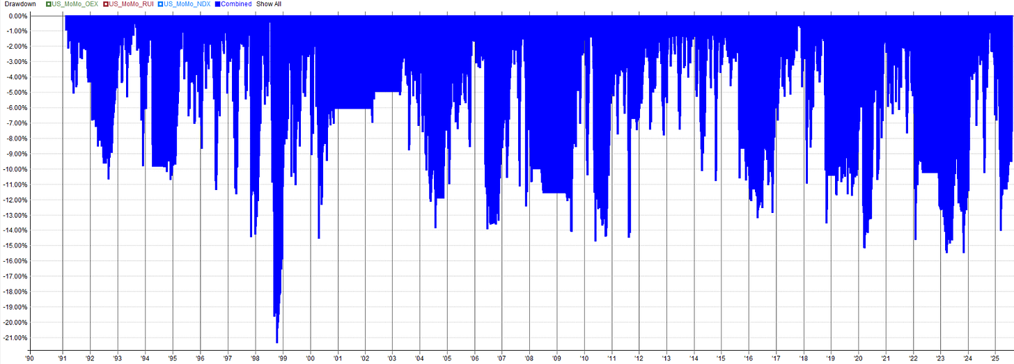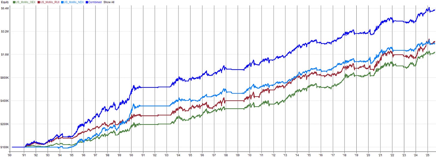 Think of this portfolio as a team. If one member of the team is performing well, the entire team benefits. The dollar allocation to each system builds or reduces based on the performance of every other system, but the percentage allocation remains static.