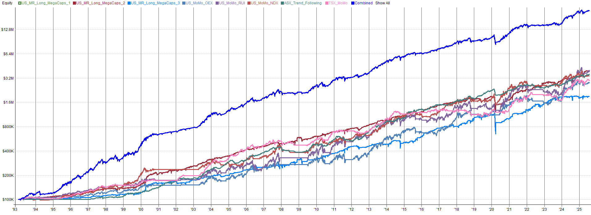 Below are the backtested equity curves and performance metrics for each of the four systems we have developed thus far: