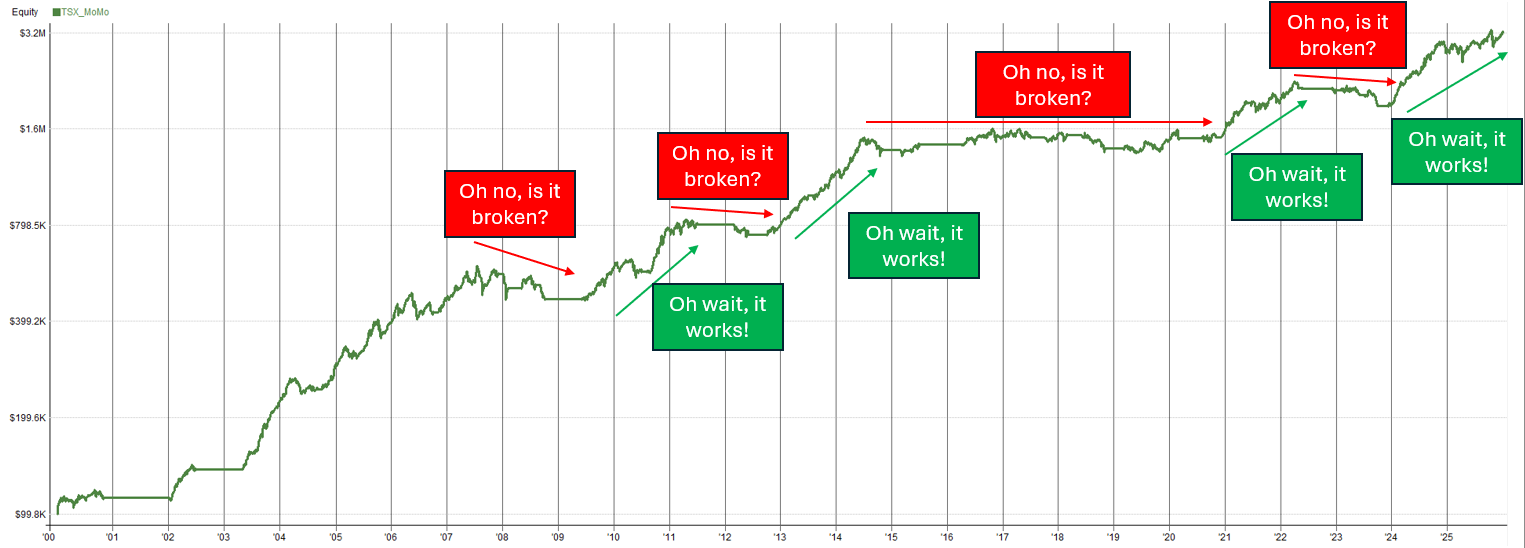 Notice how the TSX market index has large drawdowns and sideways periods at the exact same times as the momentum system struggled. So, just through basic reasoning of how this system works, we may be able to convince ourselves it’s the market rather than the system.